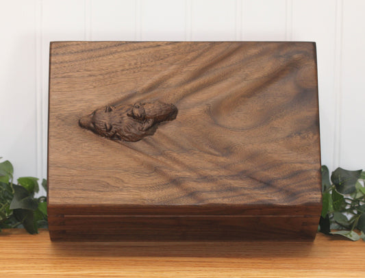 Dovetail Keepsake Box, Black Walnut wood box, Memory Box, Carved Bear in water Box. Cub in water.